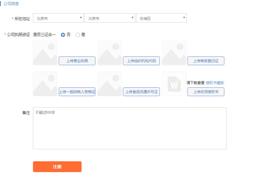 Tips:注册供应商需要提供营业执照,一般纳税人资格证、税务登记证等信息,为简化注册流程,一件代发客户直接注册分销商即可。