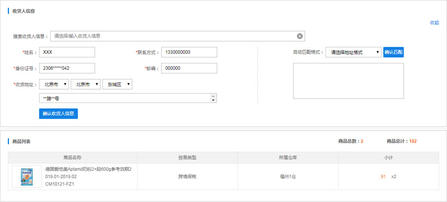(2)保税和直邮订单需要提交收件人真实有效身份证号码,请注意: 保税直邮订单收件人姓名必须与身份证上一致,且与身份证号码匹配,否则可能清关失败。