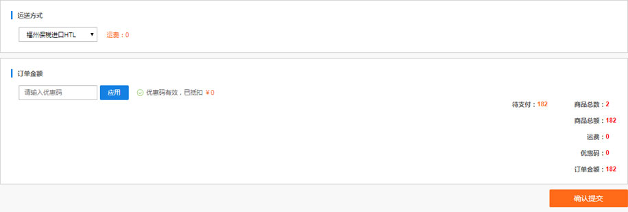 (3)优惠码使用以及选择快递方式(一般贸易产品有多种快递方式可选,不同快递方式运费不同,选择适合您的物流方式即可! 保税和直邮订单物流方式不可选)。 一般贸易订单选择物流方式的简介: a. 物流类快递如友信物理、鑫达源物流属于大批量采购,运费起点高; b. 顾客自提,下单成功后自行前往仓库提货,可以向业务经理咨询到仓库提货的时间、地点等信息; c. 仓到付 快递方式由仓库确定,包裹收件时支付运费; d. 液体类小包裹产品尽量选择发德邦/顺丰快递,液体类产品如果货损韵达不赔付; e. 工电子艺品类产品请选择工艺品专用快递。